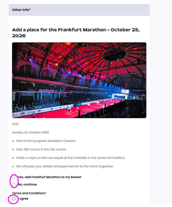 - 10月26日のフランクフルトマラソン参加の場合は「Yes」、不参加は「No」にチェック。