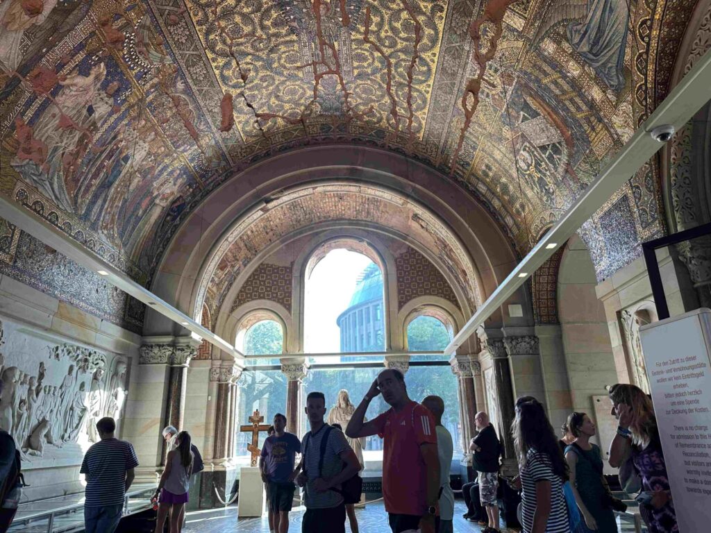 損壊したままの外観と教会内の金色のモザイク天井画が見どころ。