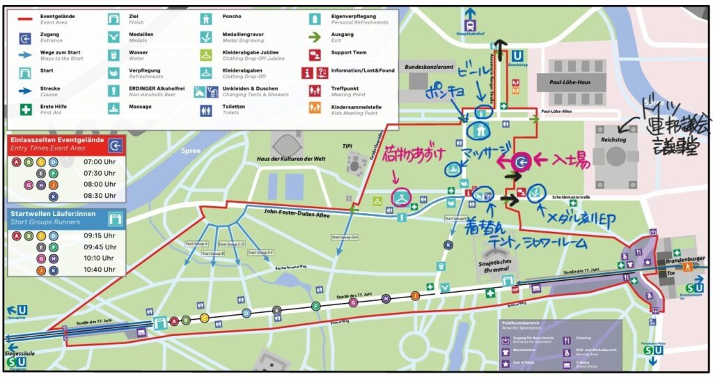 | スタート& ゴール会場 | Großer Tiergarten (ティーアガルテン) | 徒歩10分圏内の最寄り駅 ・Brandenburger Tor(ブランデンブルグ門駅) S1,S2,S25,S26線 ・Berlin Hbf(ベルリン中央駅) S7,S5線 ・Friedrichstraße(フリードリヒシュトラーゼ駅) S1,S2,S5,S7,S25,S26,U6線 |