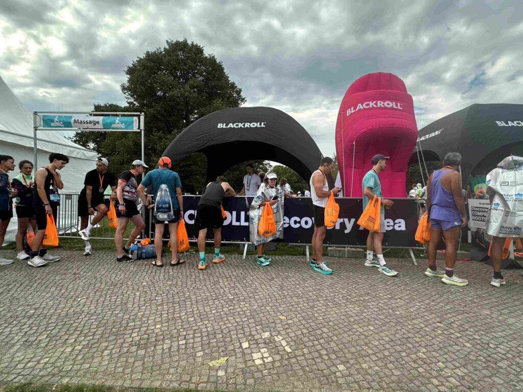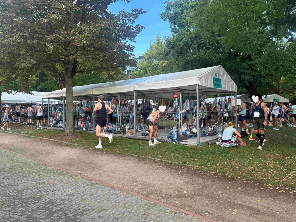 スタートブロックに向かう途中、事前申込者限定の預け荷物テント。