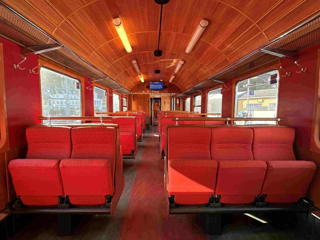 スーツケースかかえて車内へ、レトロな内装にテンションあがるっ!😍