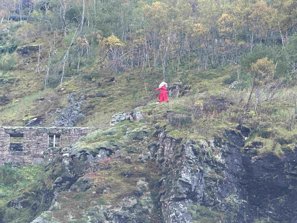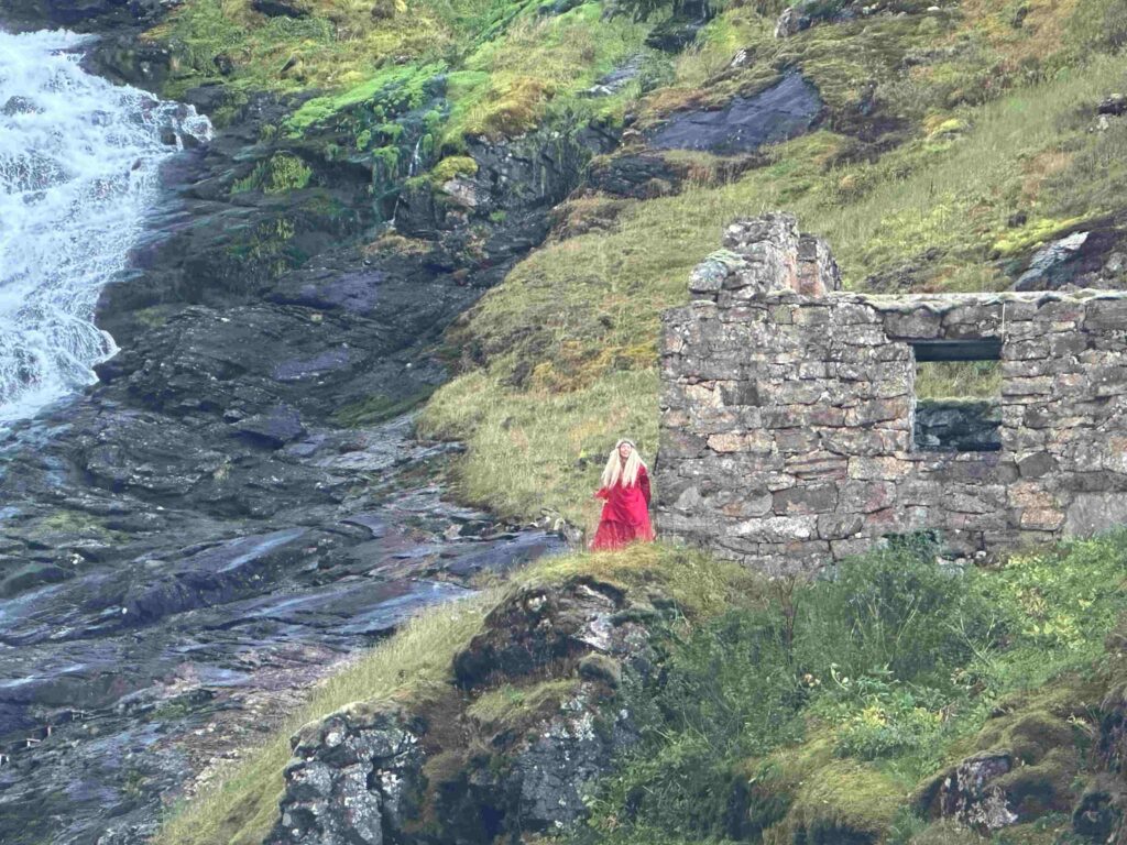 ・シヨースの滝で妖精ノラさんのパフォーマンス(音楽つき)。 - ミュルダール駅
