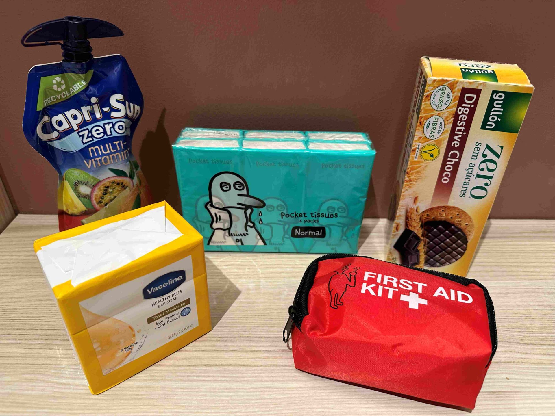 ビタミンジュースは旅の栄養補給に。チョココーティングのグルテンフリークッキーはたくさん食べても罪悪感ゼロ(しかも美味しい)♪石鹸とティッシュはバラマキ土産です。