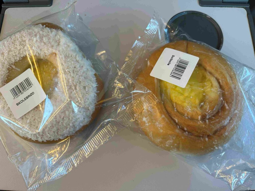 小腹用に菓子パン、2個で30NOK(480円)。日本のスーパーで売ってるパン同等のクオリティ。