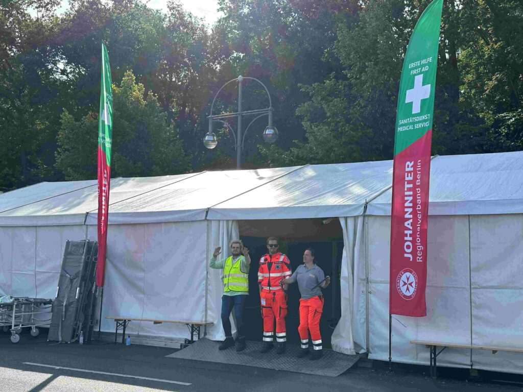 ゴールの左のメディカルテント、音楽に合わせて踊ってる陽気な救護隊。