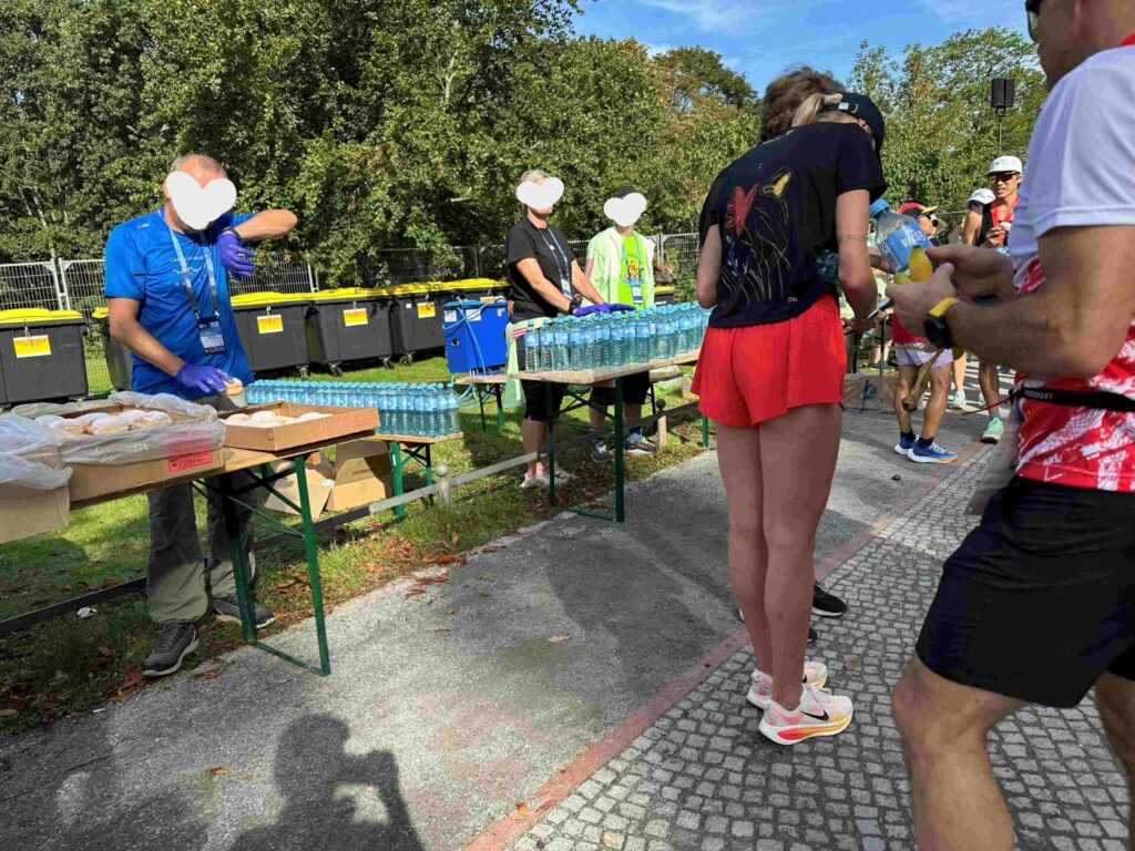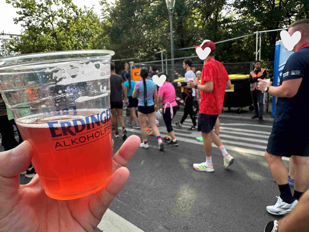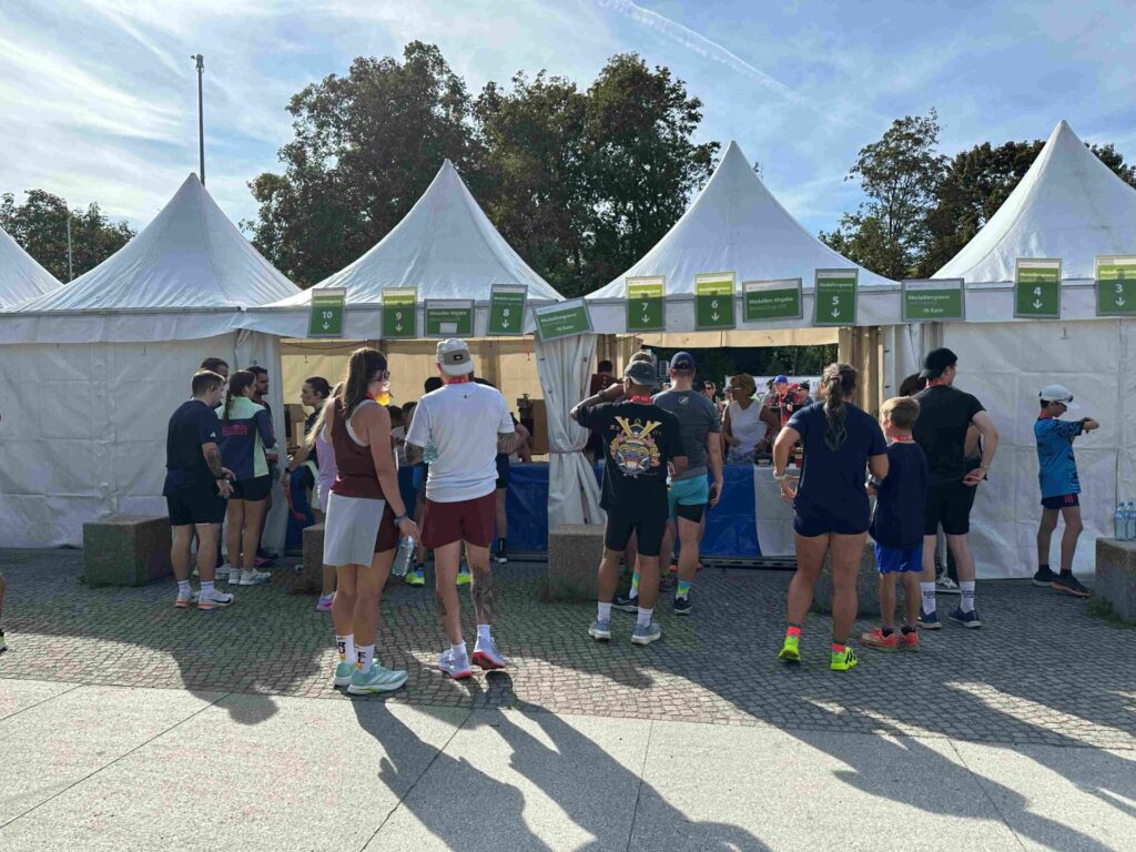完走メダル➯給食エリア(ベルリーナ(菓子パン)、バナナ、ペットボトルの水)➯エルディンガーノンアルビール(テントずらり)。