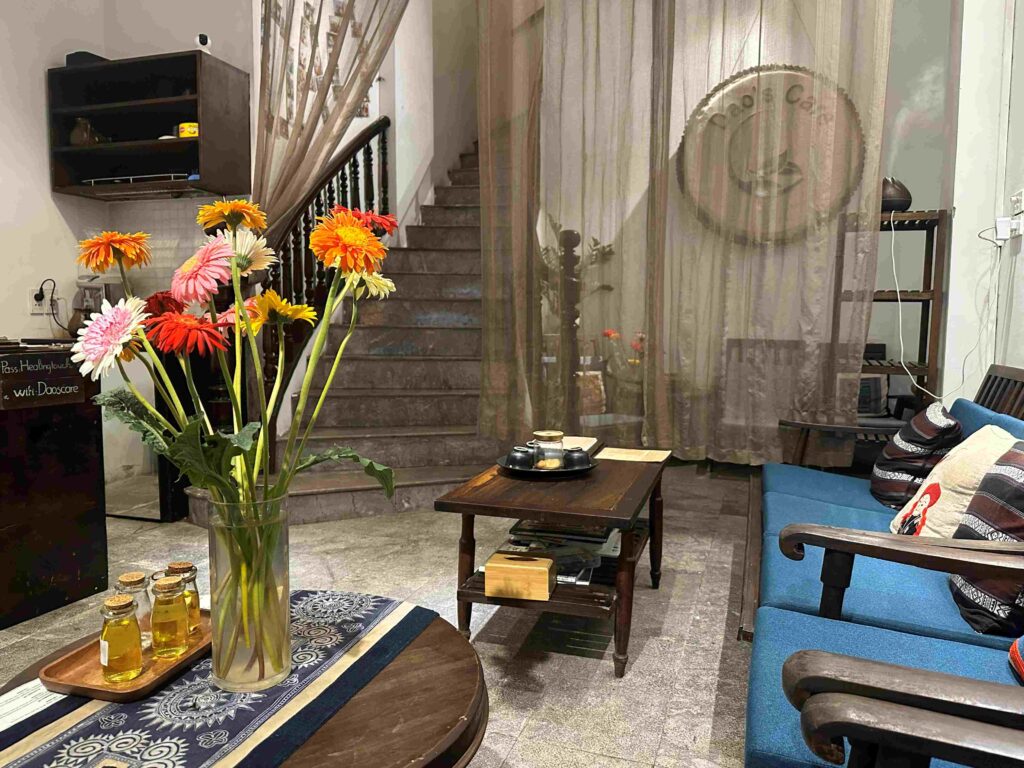 ベトナムテイストのロビー。ソファーにかけて問診記入。支払いは終了後に現金で。