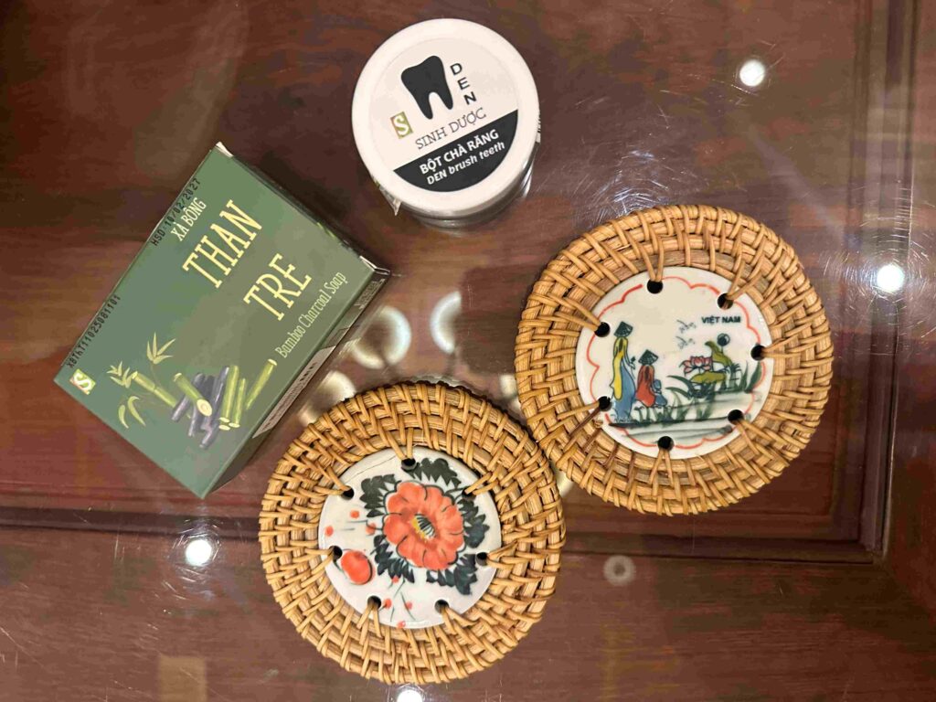 陶器のコースターは3万ドン。ホワイトニング55万ドン。竹炭ソープ45万ドン。
