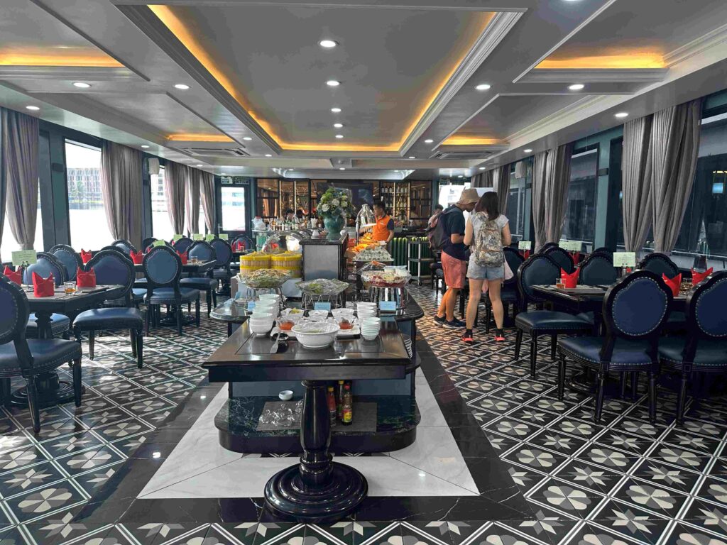 - 船は3階建て。1階と2階にビュッフェエリア。2階と3階にデッキ。3階にはジャグジーも。トイレは1階と2階に男女各1つ。
