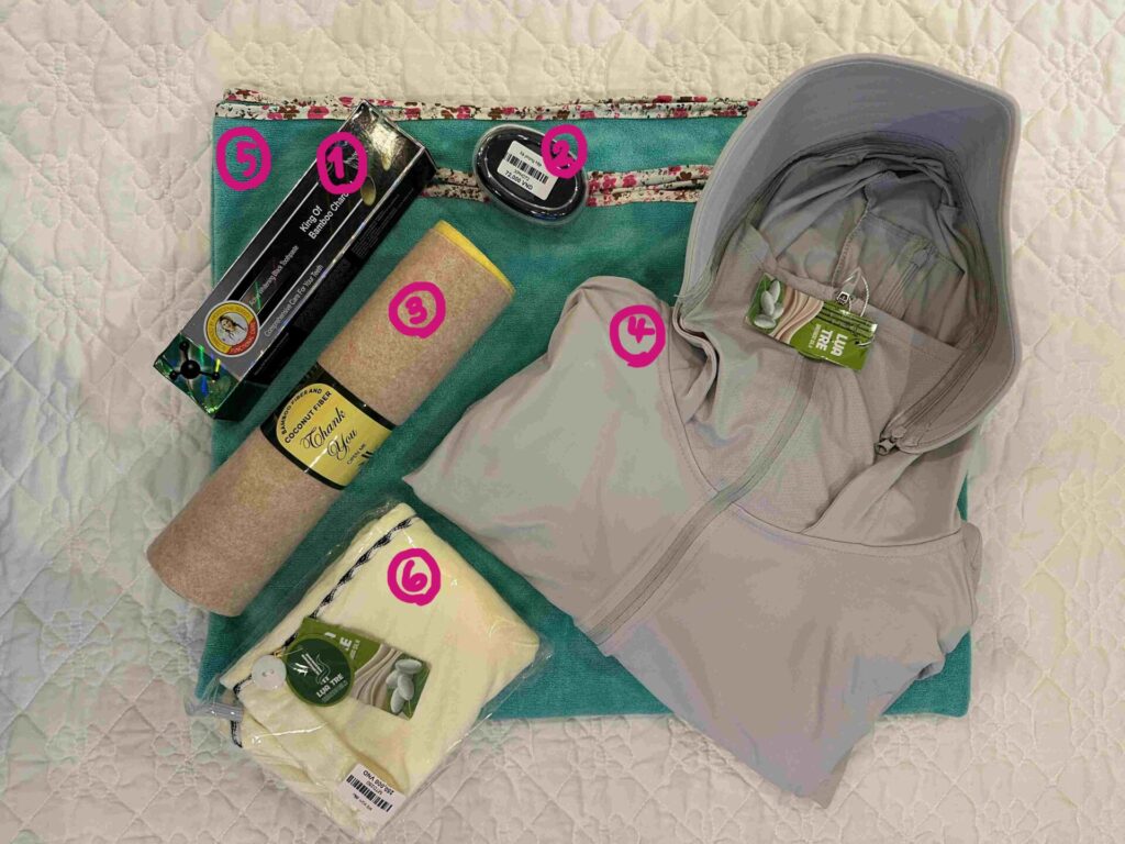 ①竹炭歯磨きペースト(105VND)②竹炭ソープ(72VND)、③キッチンタオル(6枚@120VND)、④ジャケット(980VND)、⑤バスローブ(450VND)、⑥ヘアタオル(250VND)。