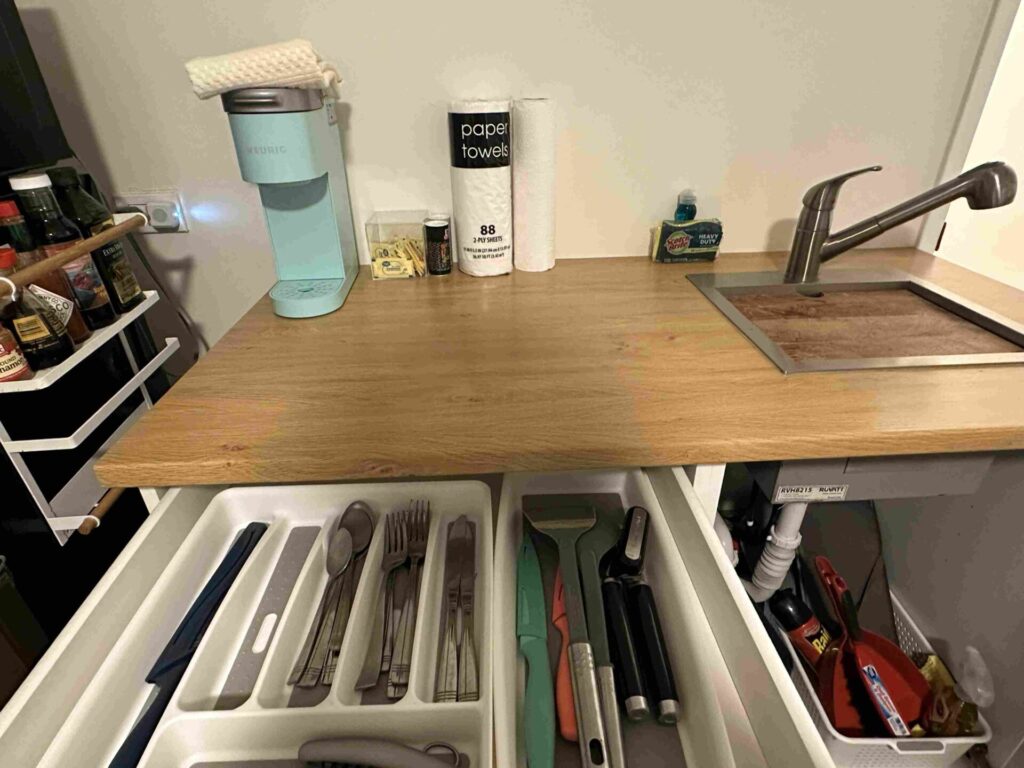 調理器具、ペーパータオル、スポンジと洗剤。