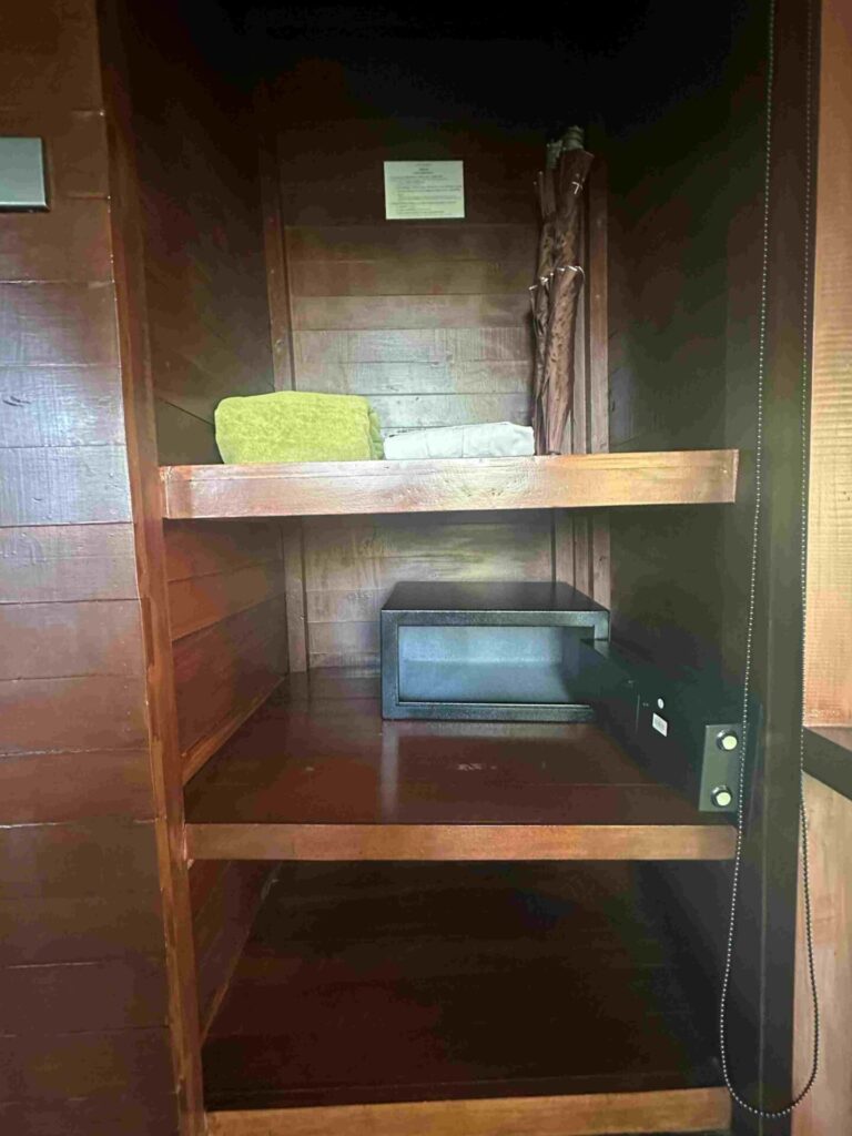 ハンガーラック、傘、ビーチタオル、バスローブ、金庫。